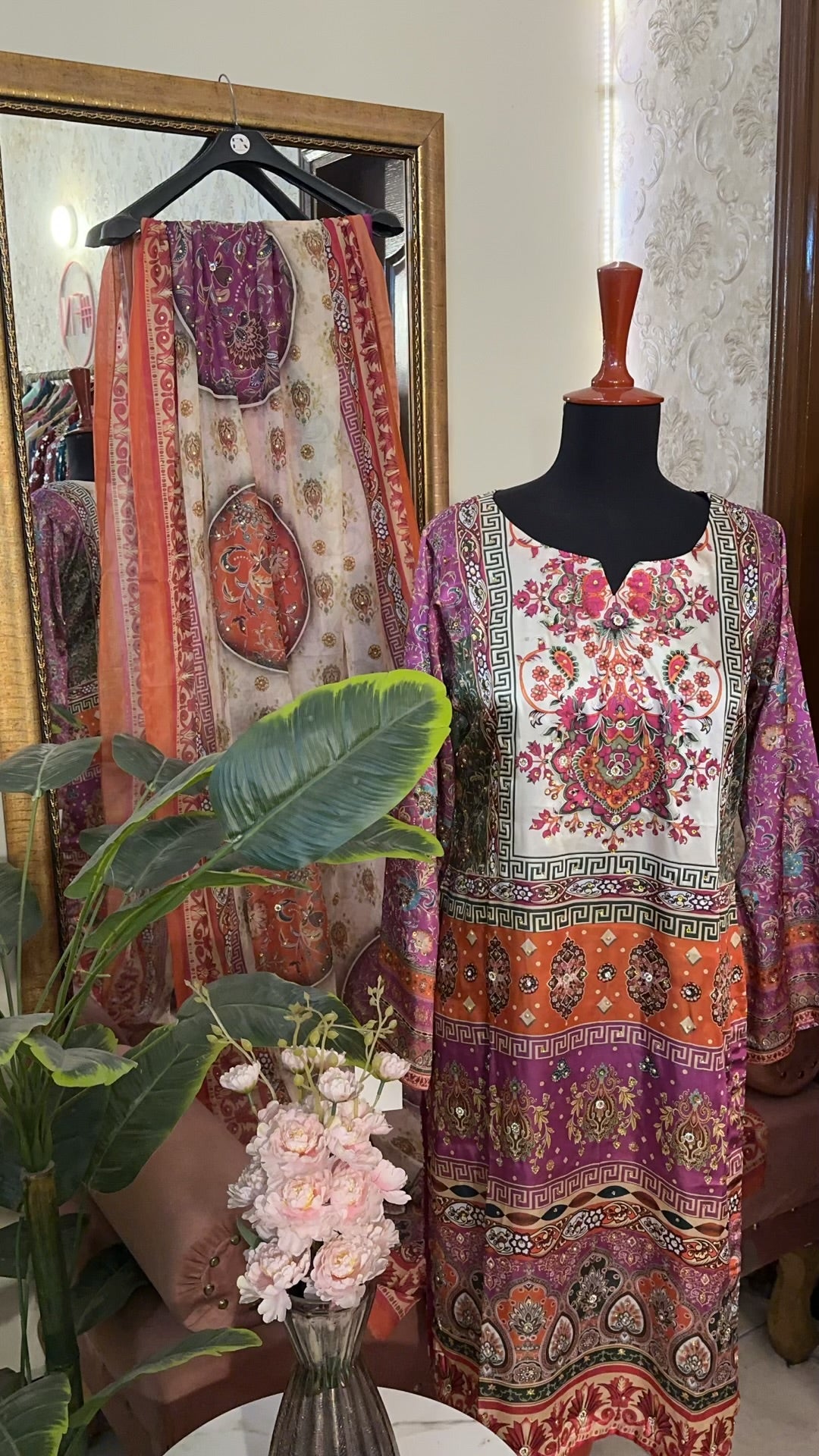 Shirt Silk fabric Printed with hand touching on shirt and dupptta Trouser silk fabric Dupatta printed Small Medium Large Extra large Available Shirt length 44 Trouser length 40 price *4800*