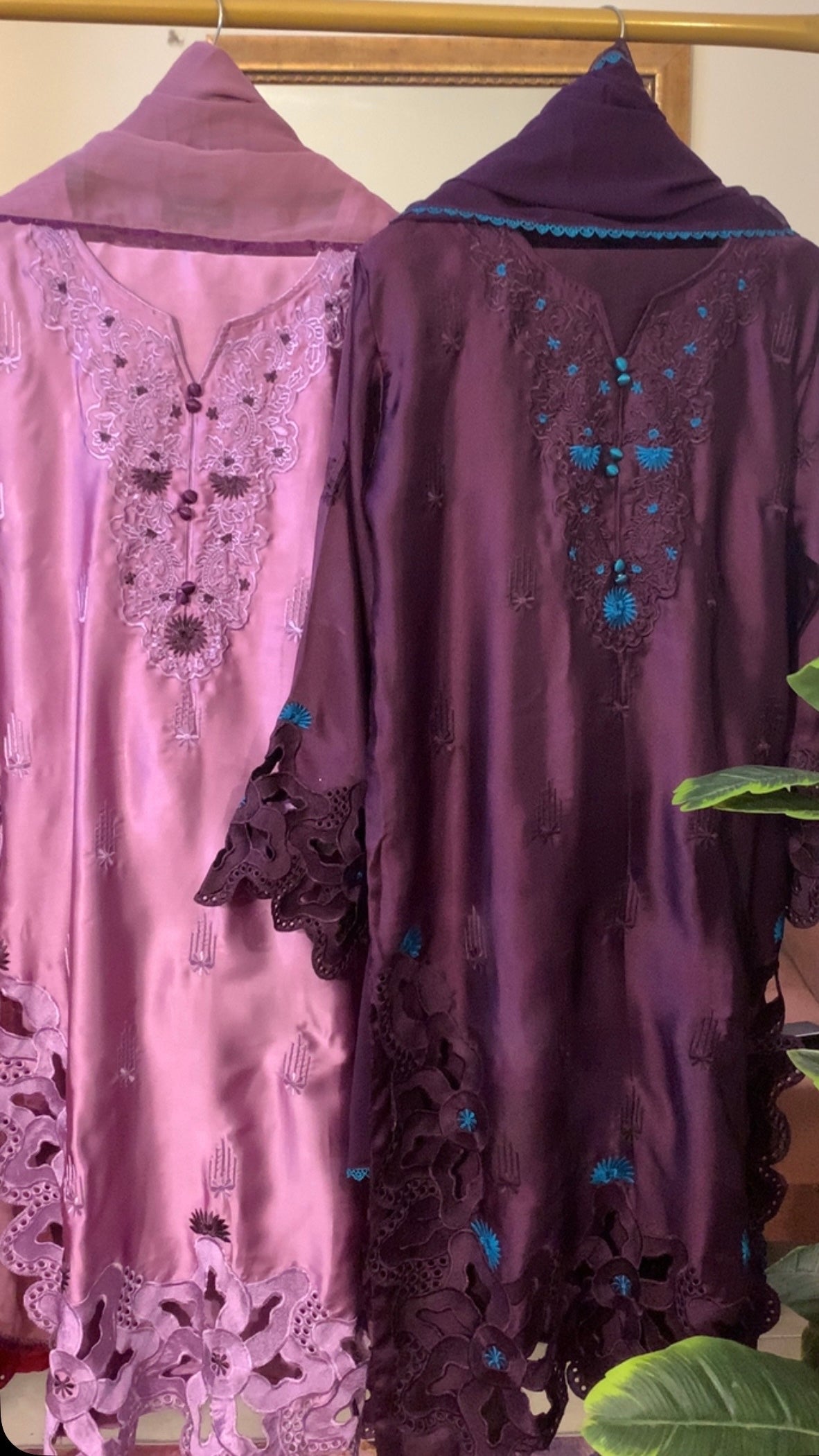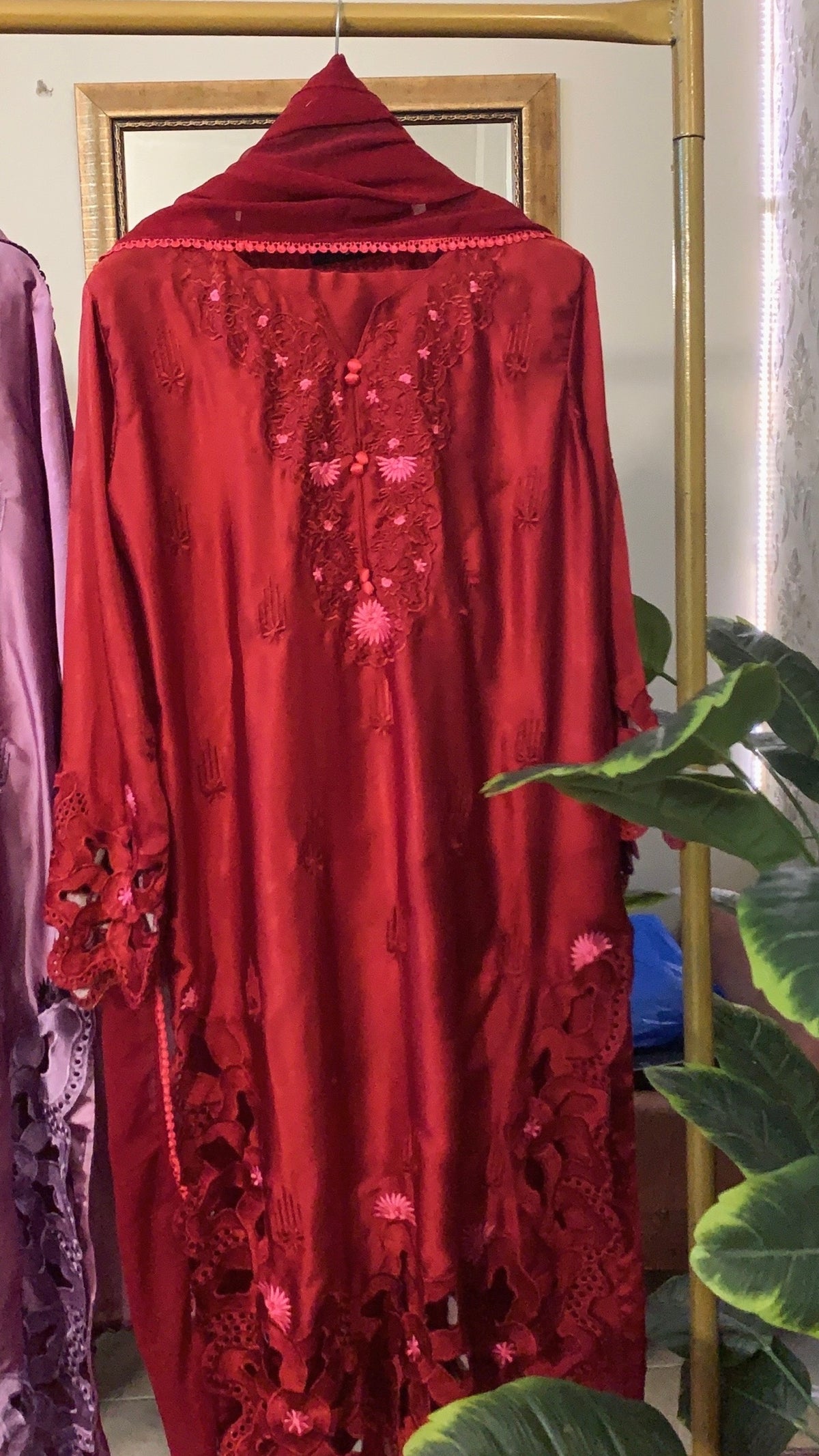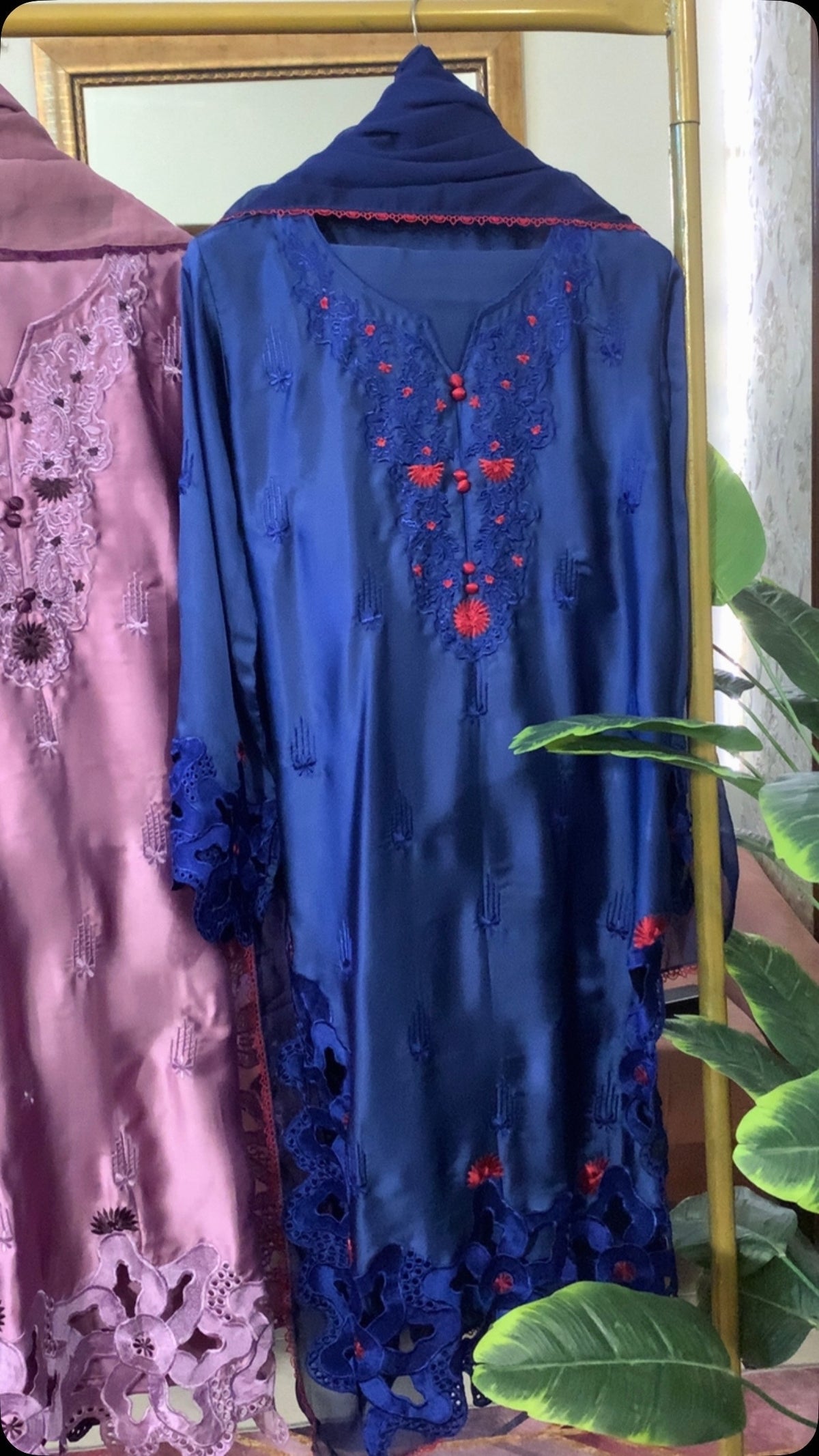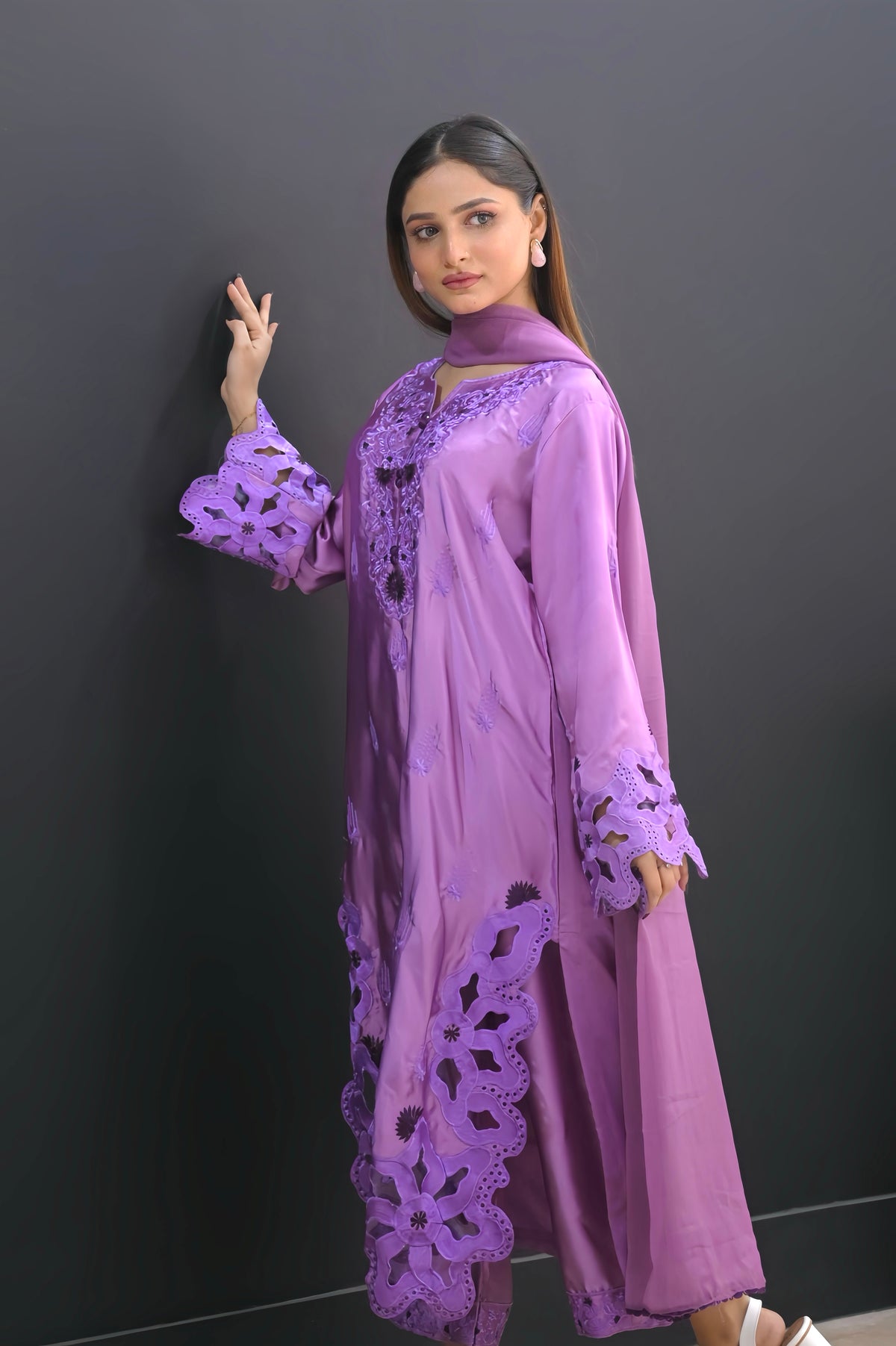 Elevate your festive wardrobe with this Pure Russian Silk 3-Piece ensemble, crafted with refined artistry. The shirt features heavy cutwork on the daman and sleeves, enhanced with intricate all-over embroidery for a premium, graceful finish. Paired with embroidered culotte pants in pure Russian silk and a pure chiffon dupatta adorned with 4-sided lace detailing, this outfit blends elegance with luxury in every stitch.