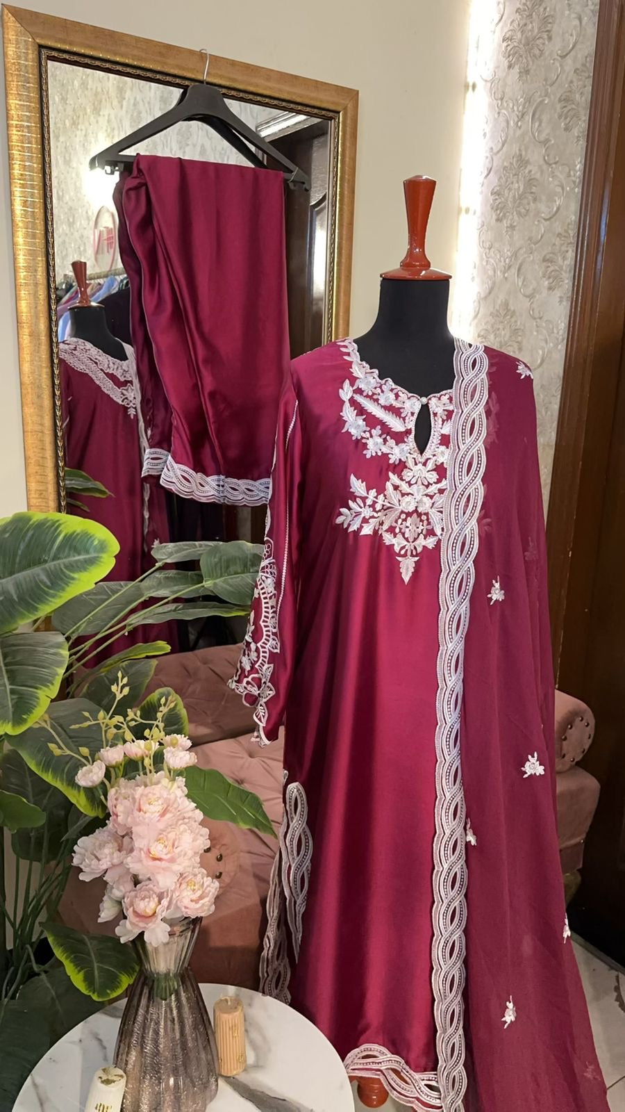 A premium Pure Russian Silk 3-Piece outfit designed with timeless elegance. The shirt features delicate embroidery on the neck and back, paired with front & back cutwork on chalks and daman for a refined luxury touch. The set is completed with a Pure Chiffon Cutwork Dupatta, creating the perfect blend of grace and sophistication.