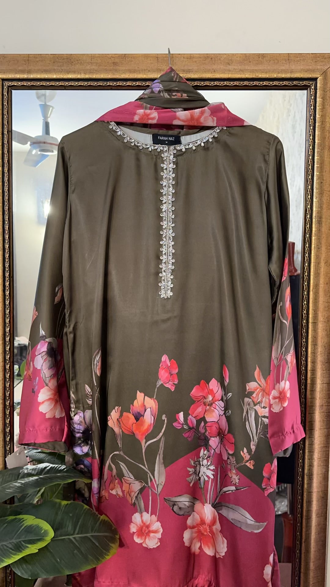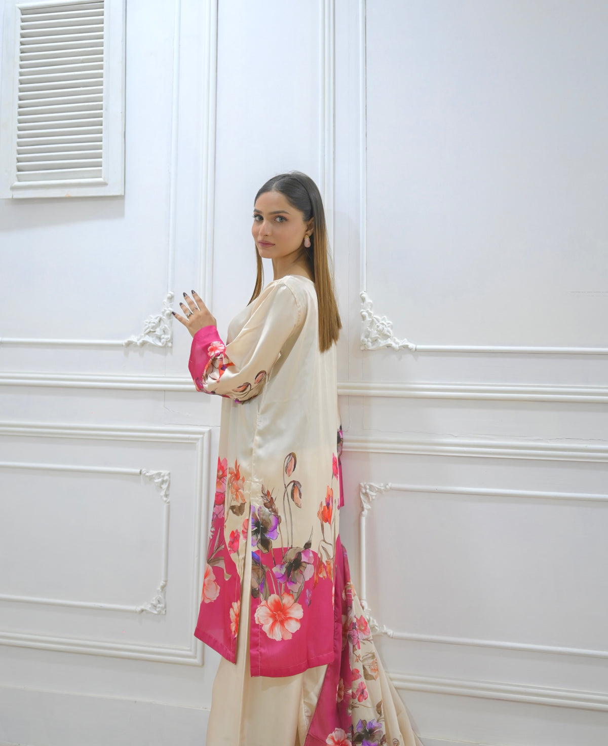 Elevate your everyday elegance with the digital-printed Pure Korean Silk Cordset “Noor” by Farahnaz Attire. Designed for effortless style, this two-piece luxury set features premium Korean silk with hand embellishment detailing, adding a refined touch to its modern silhouette. Paired with a matching digital-printed dupatta, this outfit delivers comfort, shine, and sophistication in one perfect look.