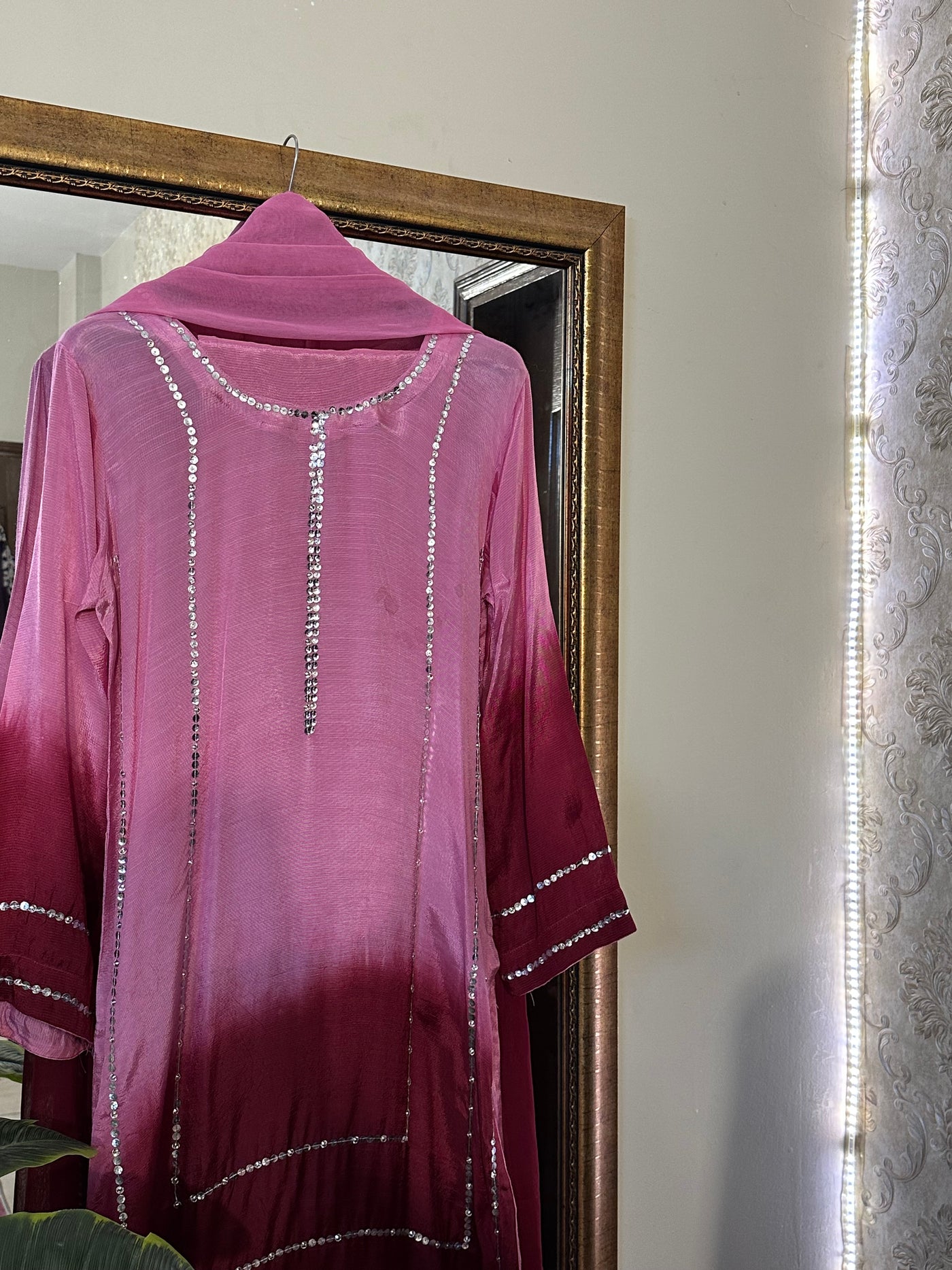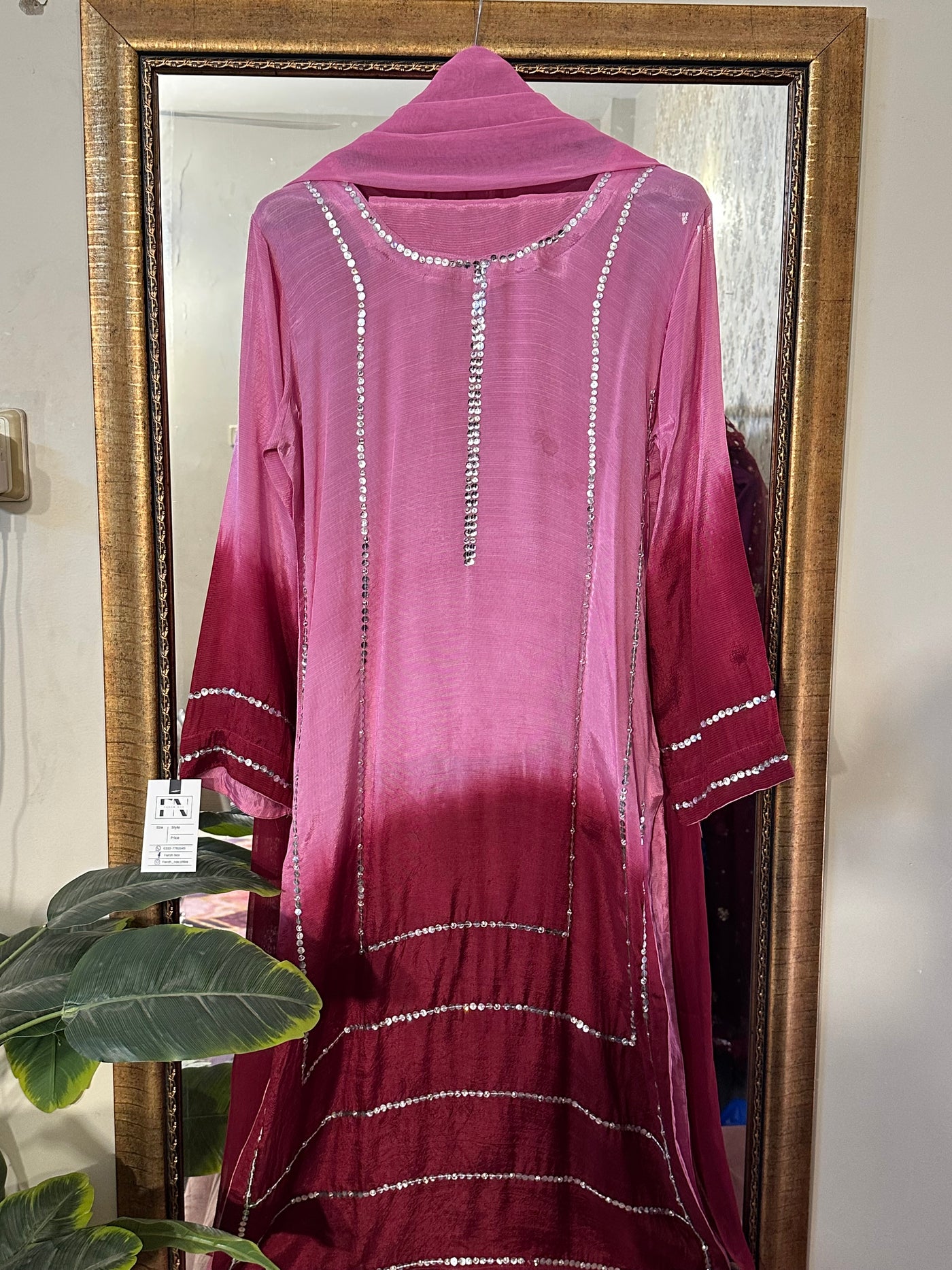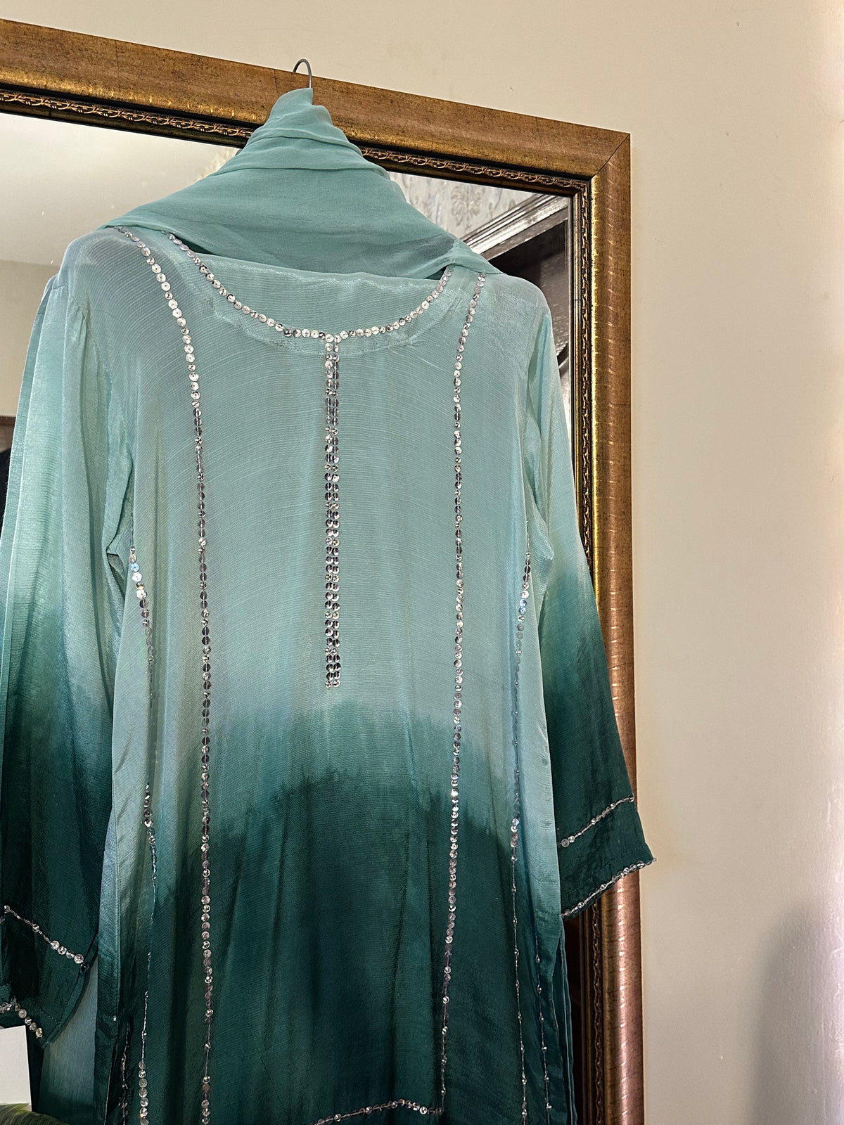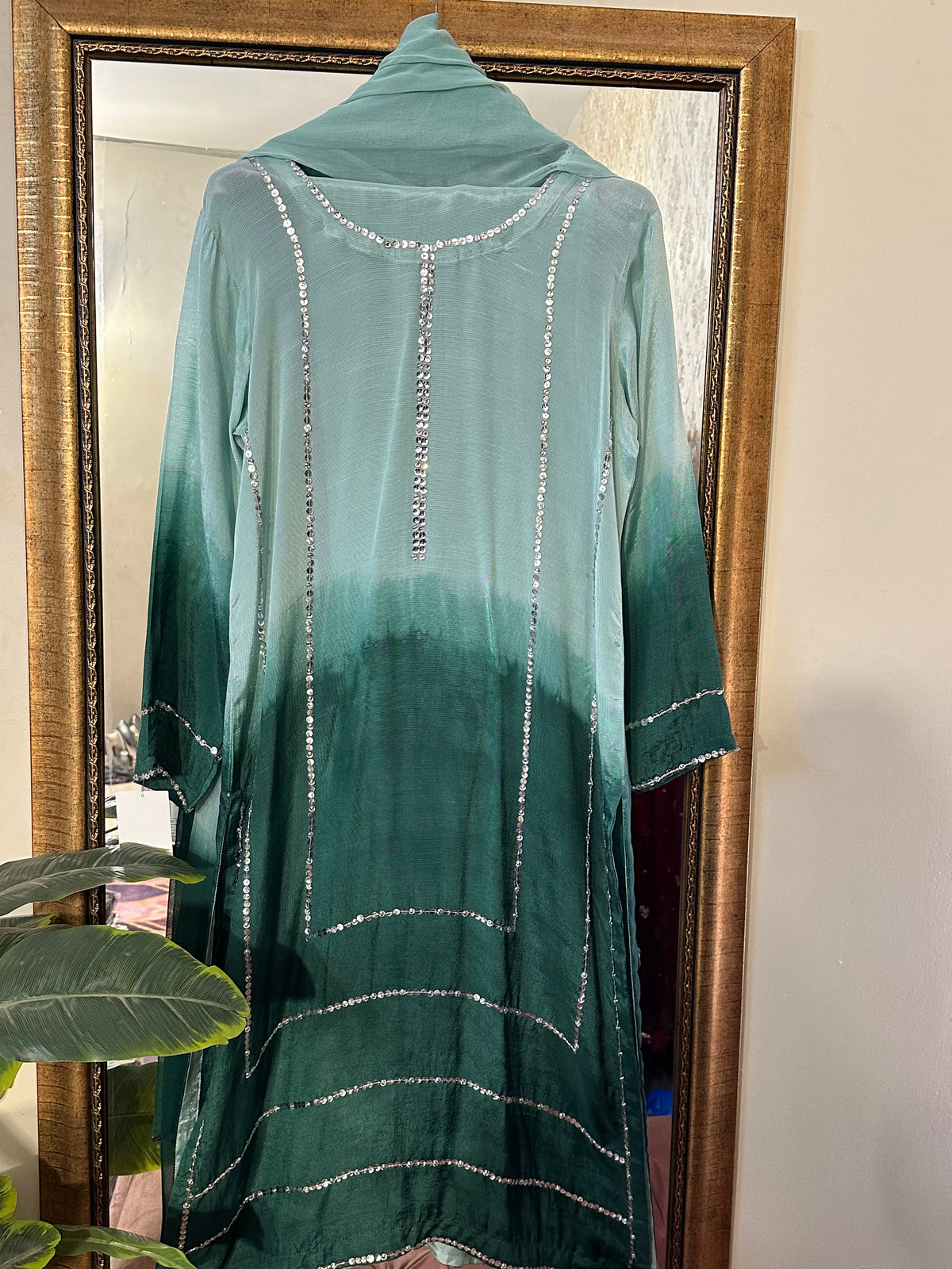 tie n dye pure raw. silk muse inspired 3pc full handwork on shirt pure raw silk trouser tie n dye pure chiffone dupptta s m l xl *teal green* *maroon* 2 clrs 6800